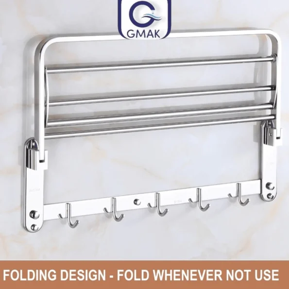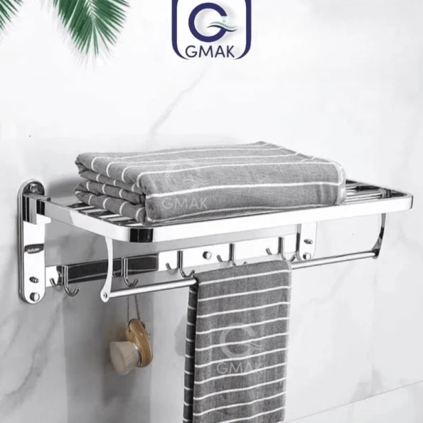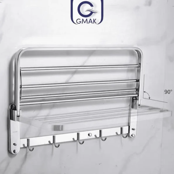 استثمر في تنظيم وأناقة حمامك. اطلب حامل البشاكير والرف القابل للطي من جيماك الآن، واستمتع بمساحة أكثر عملية وجمالاً!”